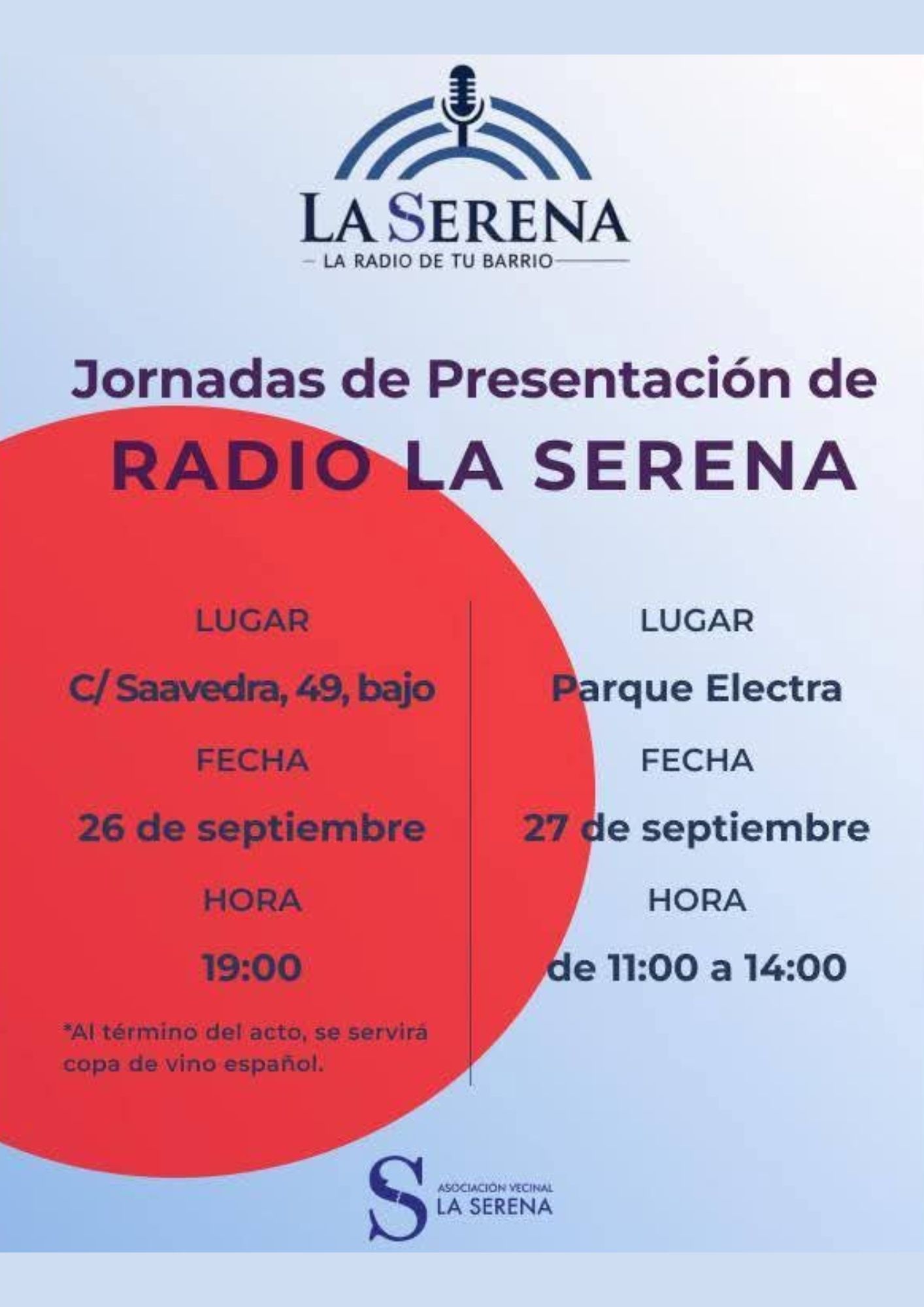 Desde la Asociación Vecinal La Serena, queremos invitaros a la presentación de “RADIO LA SERENA. La radio de tu barrio”, el próximo viernes 26 de septiembre, a las 19 horas, en el local de nuestra Asociación. Al finalizar, brindaremos con una copa de vino español.