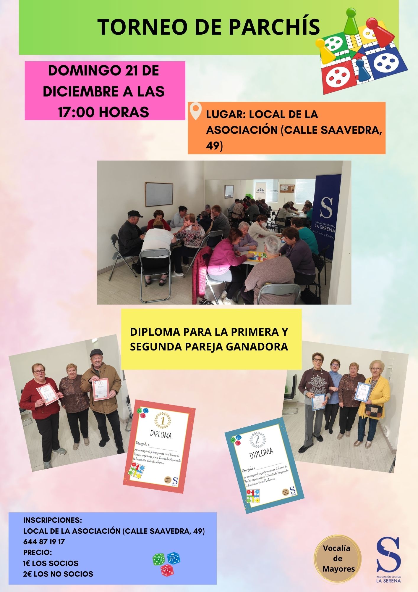 La Vocalía de Mayores de la Asociación Vecinal La Serena organiza un Torneo de Parchís para despedir el 2025 con alegría y compañerismo.