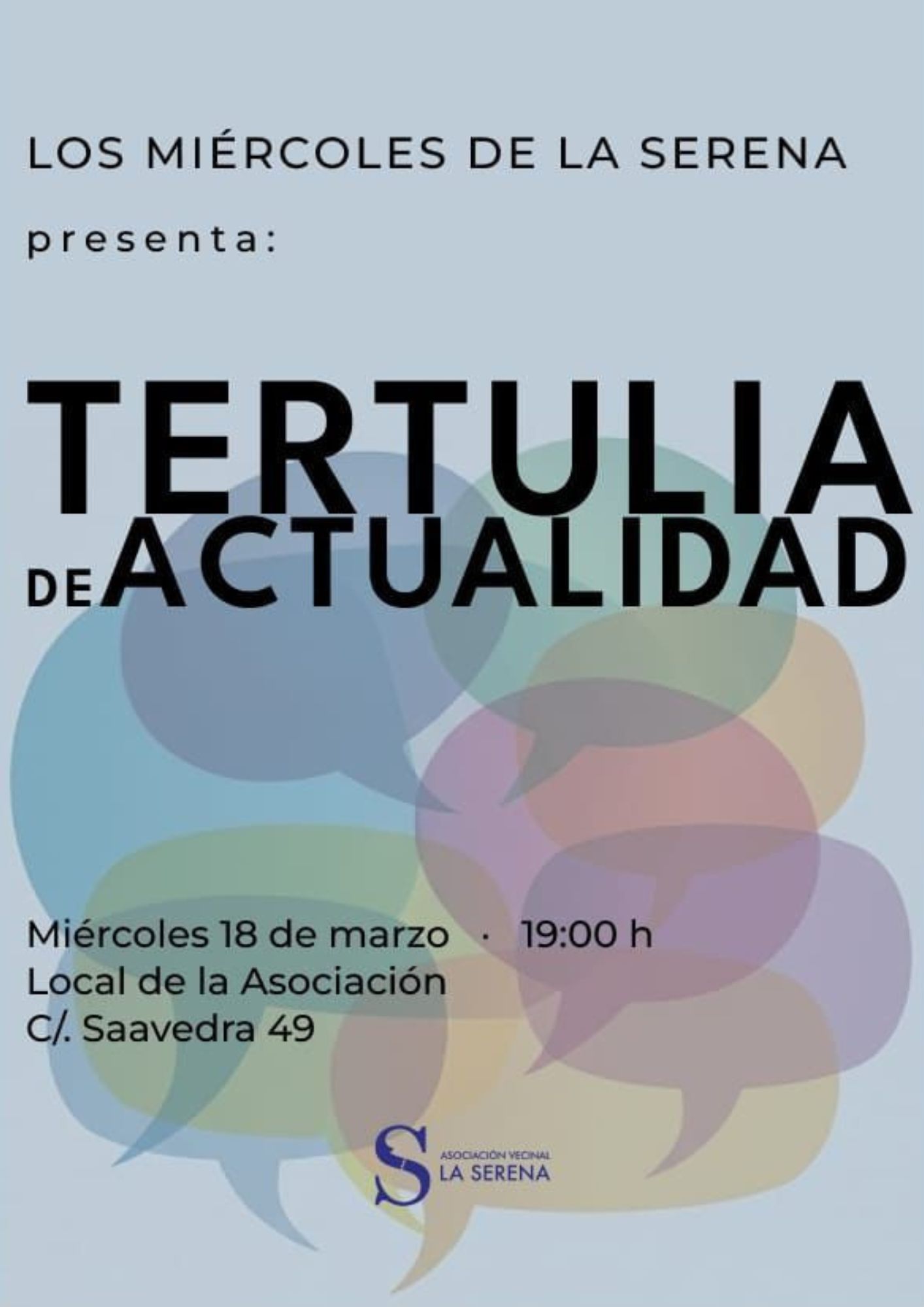 LOS MIÉRCOLES DE LA SERENA trae en esta ocasión y por primera vez a nuestra Asociación: TERTULIA DE ACTUALIDAD Conducida por Francisco Gomis, y con una selección de noticias realizada por todos los asistentes a la tertulia, analizaremos y debatiremos las principales noticias del momento: * a nivel nacional * a nivel internacional * y también a nivel local La economía, la política, la ciencia y la tecnología, la sociedad o la cultura, serán motivo de análisis por todos los…