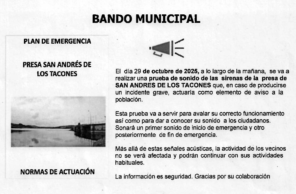 El próximo 29 de octubre de 2025, durante la mañana, se realizará una prueba de sonido de las sirenas de la Presa de San Andrés de los Tacones.