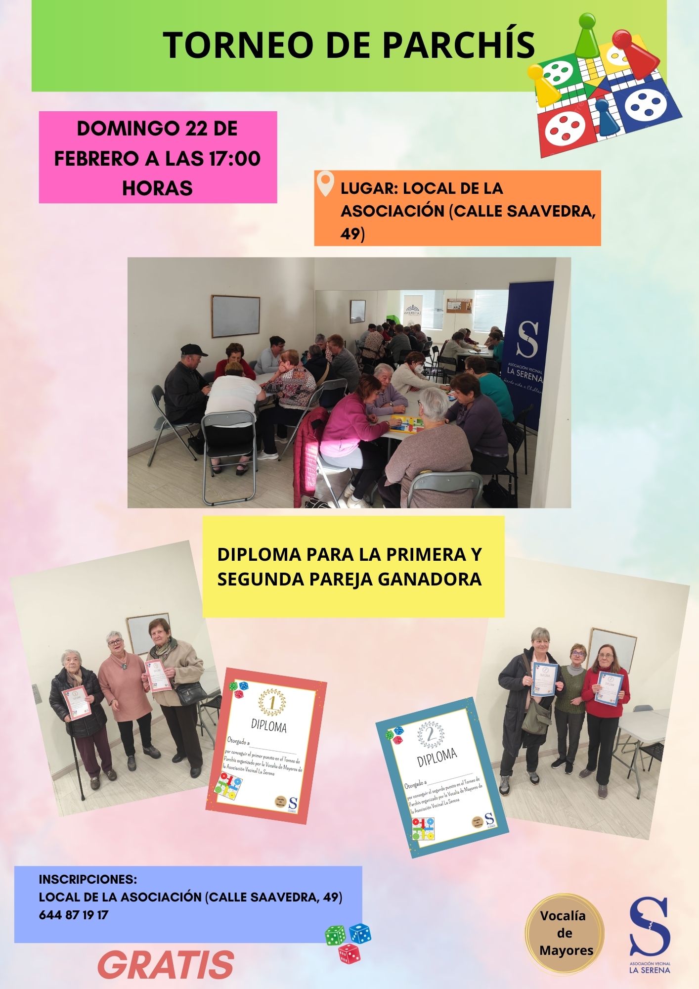 ¿Te gusta el parchís? Apúntate a nuestro torneo, organizado por la Vocalía de Mayores de la Asociación Vecinal La Serena. Pasa una tarde divertida y demostrando quién mueve mejor las fichas.