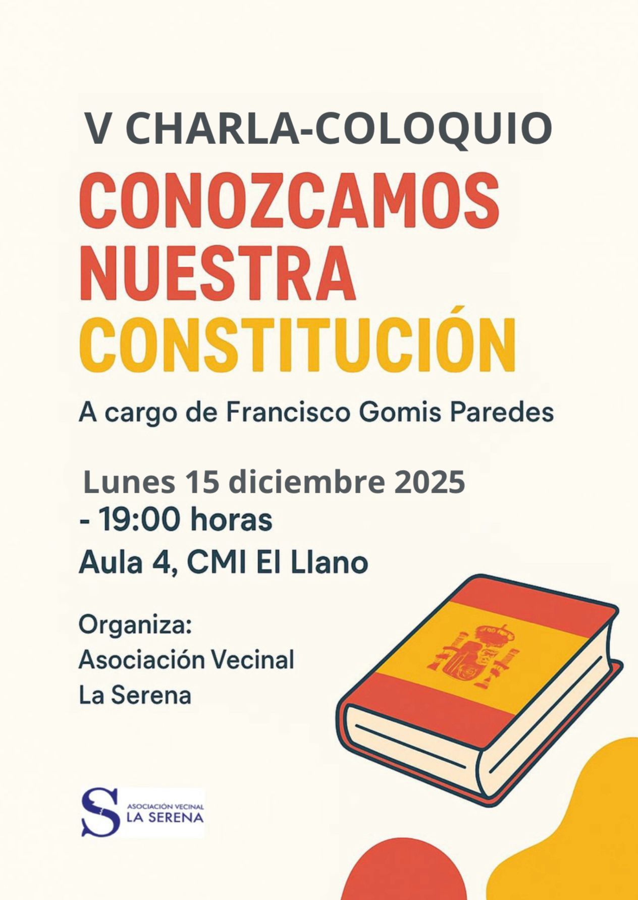 Desde la Asociación Vecinal La Serena, te invitamos a la V Charla-coloquio del ciclo “CONOZCAMOS NUESTRA CONSTITUCIÓN”, dedicado a la Constitución Española de 1978, a cargo de Francisco Gomis Paredes, jurista.